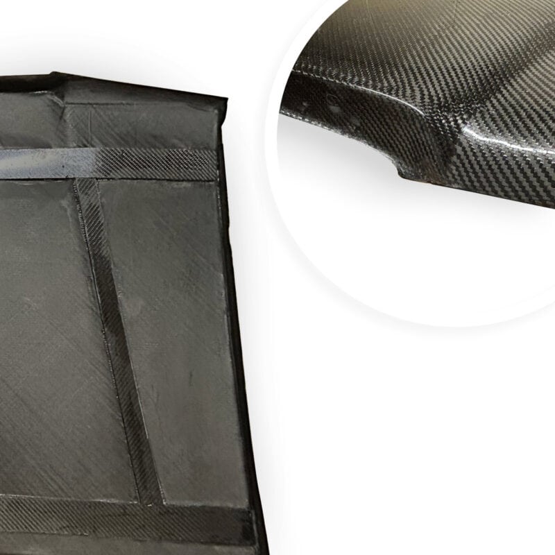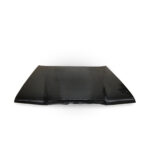 Die Motorhaube ist passgenau und verwendet originale Anschraubpunkte im Bereich der Scharniere. Im vorderen Bereich ist die Haube mit Motorsport-Schnellverschlüssen zu sichern. Während die Haube aus Carbon gefertigt ist, handelt es sich nicht um Sichtcarbon. Die Haube erhält einen herkömmlichen Lackaufbau und fügt sich so ins Fahrzeugbild ein.
